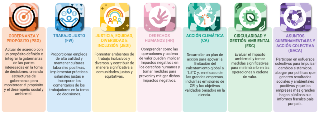La diferencia más relevante que traen los nuevos estándares B Corp con respecto al modelo anterior es que el sistema deja de basarse en una puntuación acumulativa mínima (los históricos “80 puntos”) para pasar a exigir requisitos obligatorios de desempeño en siete temáticas de impacto: Propósito y Gobernanza de las partes interesadas; Trabajo Justo; Justicia, Equidad, Diversidad e Inclusión (JEDI); Derechos Humanos; Acción Climática; Gestión Ambiental y Circularidad; y Asuntos Gubernamentales y Acción Colectiva.