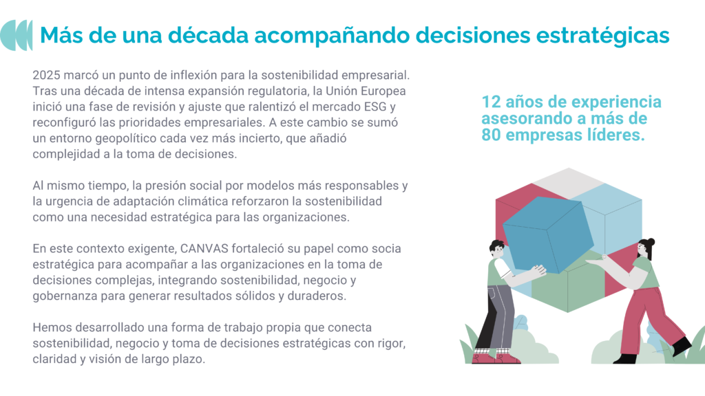 Presentamos nuestro Informe de Impacto 2025: CANVAS consolida su evolución como socia estratégica de equipos directivos que necesitan decidir con claridad en contextos complejos, integrando sostenibilidad, negocio y regulación. Seguimos creciendo en actividad y capacidad de ayudar a las organizaciones a tomar decisiones estratégicas integrando sostenibilidad, negocio y gobernanza.